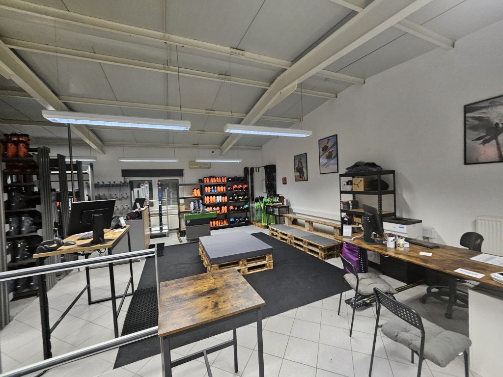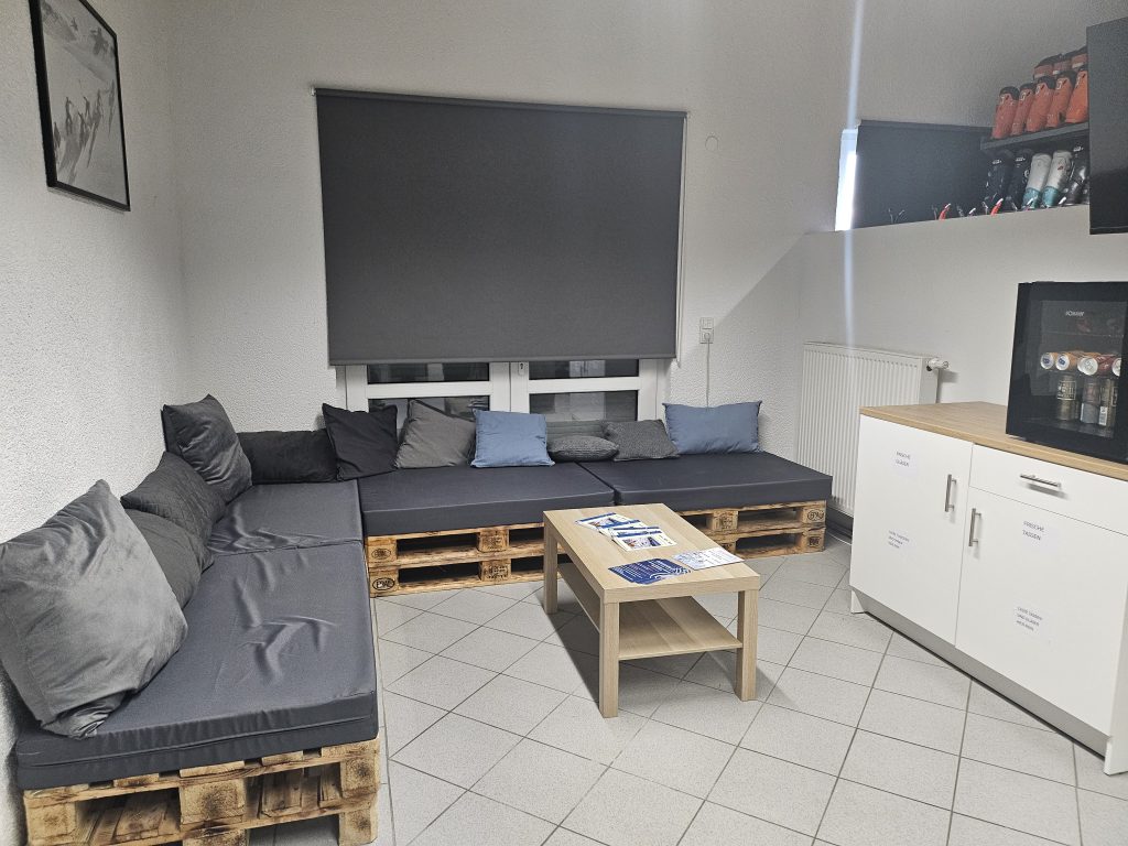 Unsere Skigarage ist inzwischen zu einer Skihalle gewachsen. Den ursprünglichen Namen haben wir bewusst beibehalten, um unsere Anfänge in der kleinen Garage zu würdigen. Der Raum hat sich deutlich vergrößert: Wir bieten jetzt eine Verkaufsfläche von 80 qm sowie eine Werkstatt mit 60 qm. Großzügige Ski- und Schuhschränke erleichtern die Entnahme und Ausgabe unseres Verleihmaterials. Ein gemütlicher Wartebereich mit Kaffee und kühlen Getränken sorgt für angenehme Wartezeiten. An zwei Verleihterminals werden die Ausleihvorgänge schnell abgewickelt, ergänzt durch eine separate Kasse. So reduzieren wir Wartezeiten erheblich.