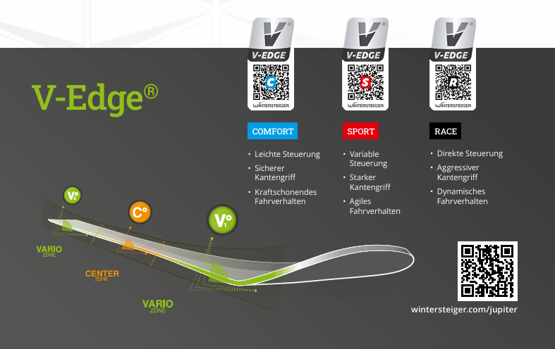 V-Edge ist die innovative Methode des Skiservice. Dabei werden die Kanten auf unserer Jupiter-Schleifmaschine mit unterschiedlichen Winkeln bearbeitet. Vorne und hinten sind die Winkel größer, um das Einleiten der Kurve zu erleichtern. In der Mitte sorgt ein kleinerer Winkel für optimalen Grip und besseren Halt in der Kurve.